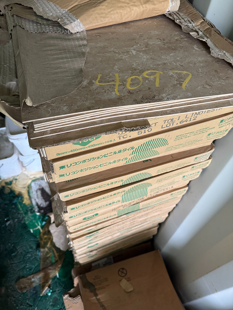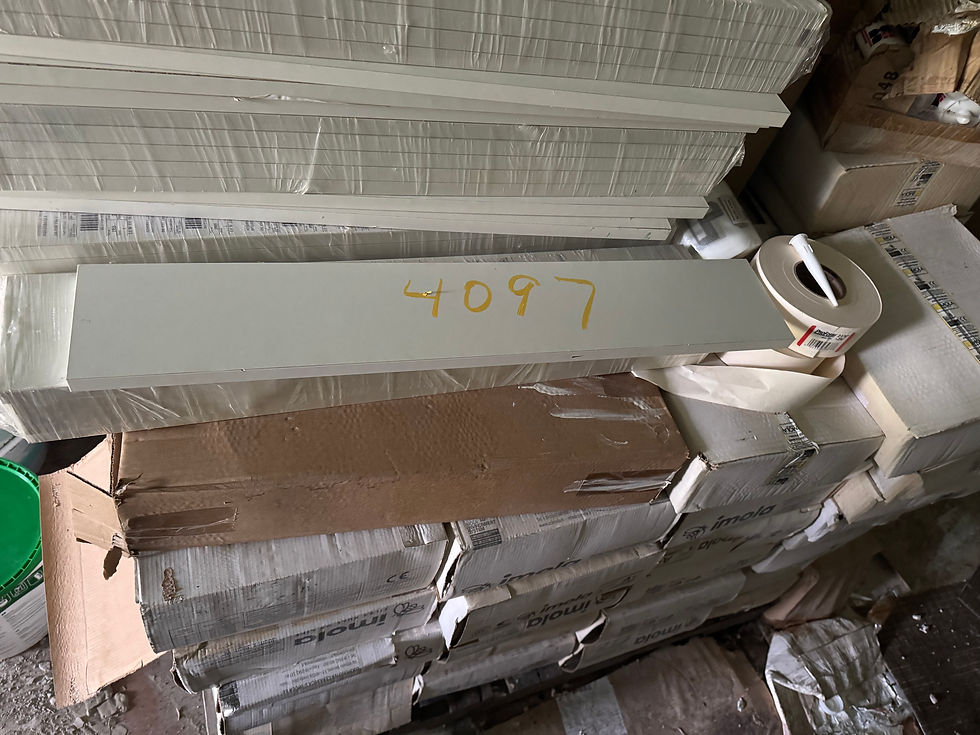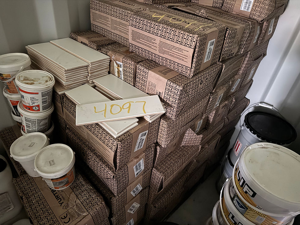 Container with contents, i.e. paint, cabinet doors, tile, etc. SOLD OFF-SITE, Container is approximately 40 miles from Auction grounds, and buyer is responsible for moving.